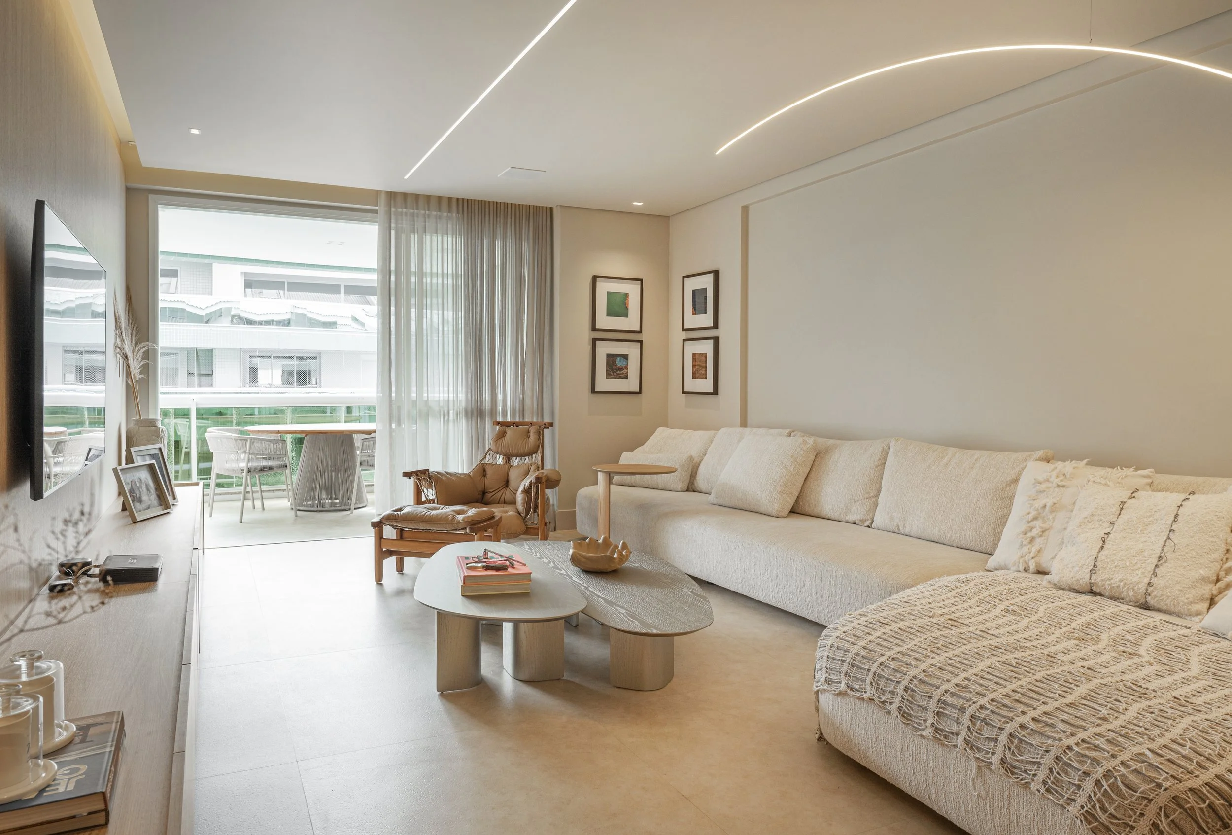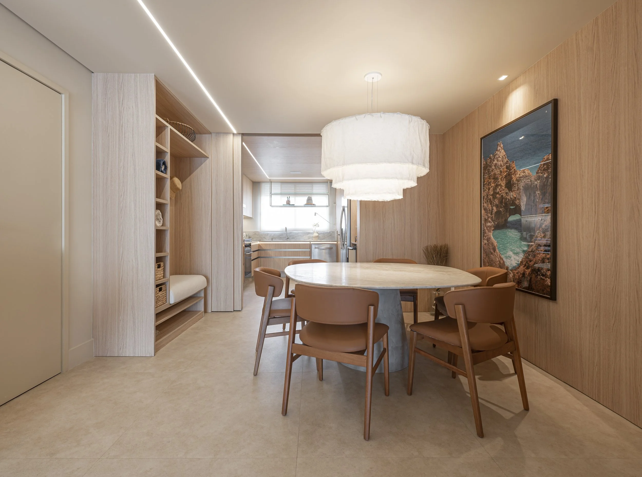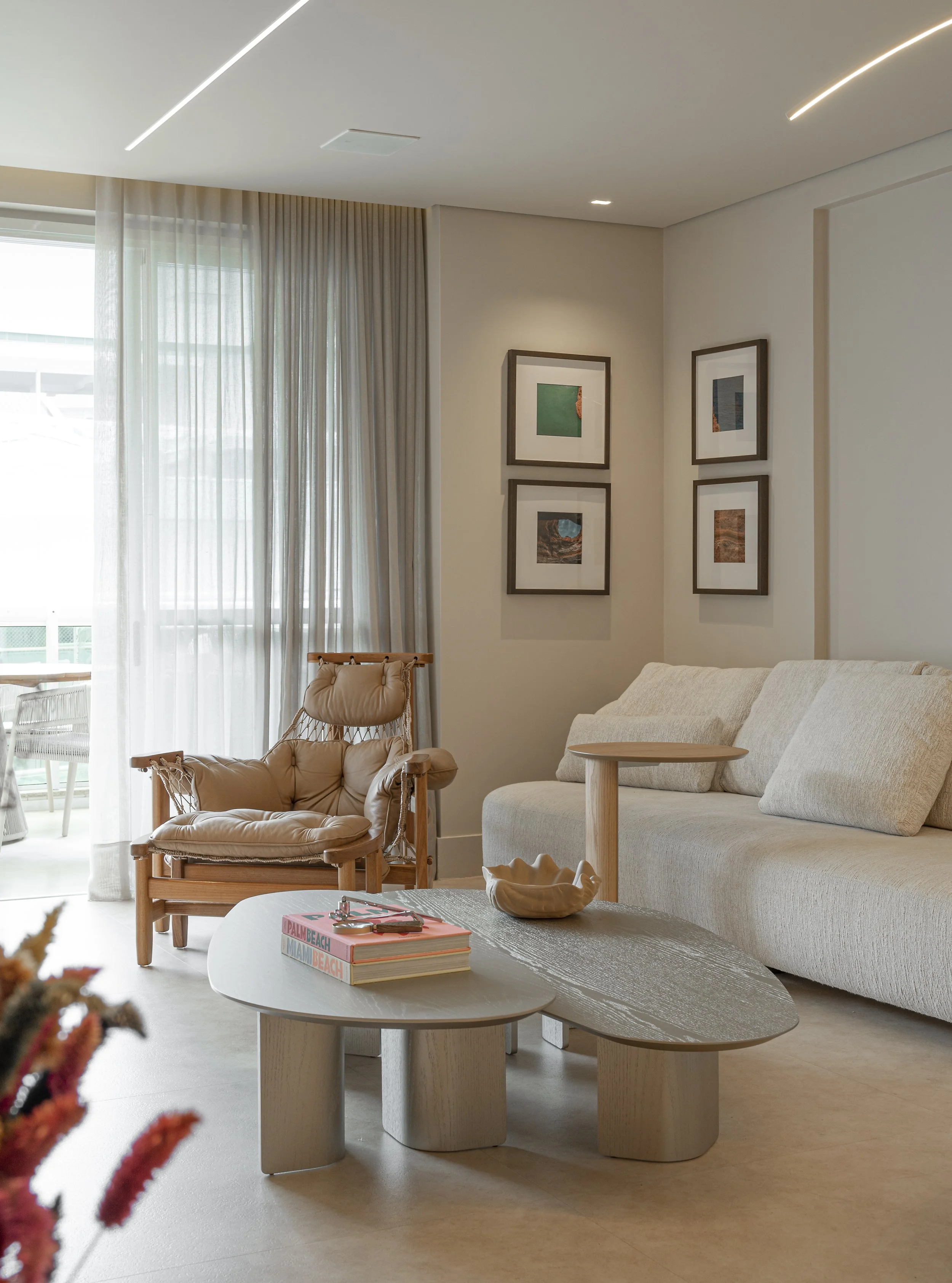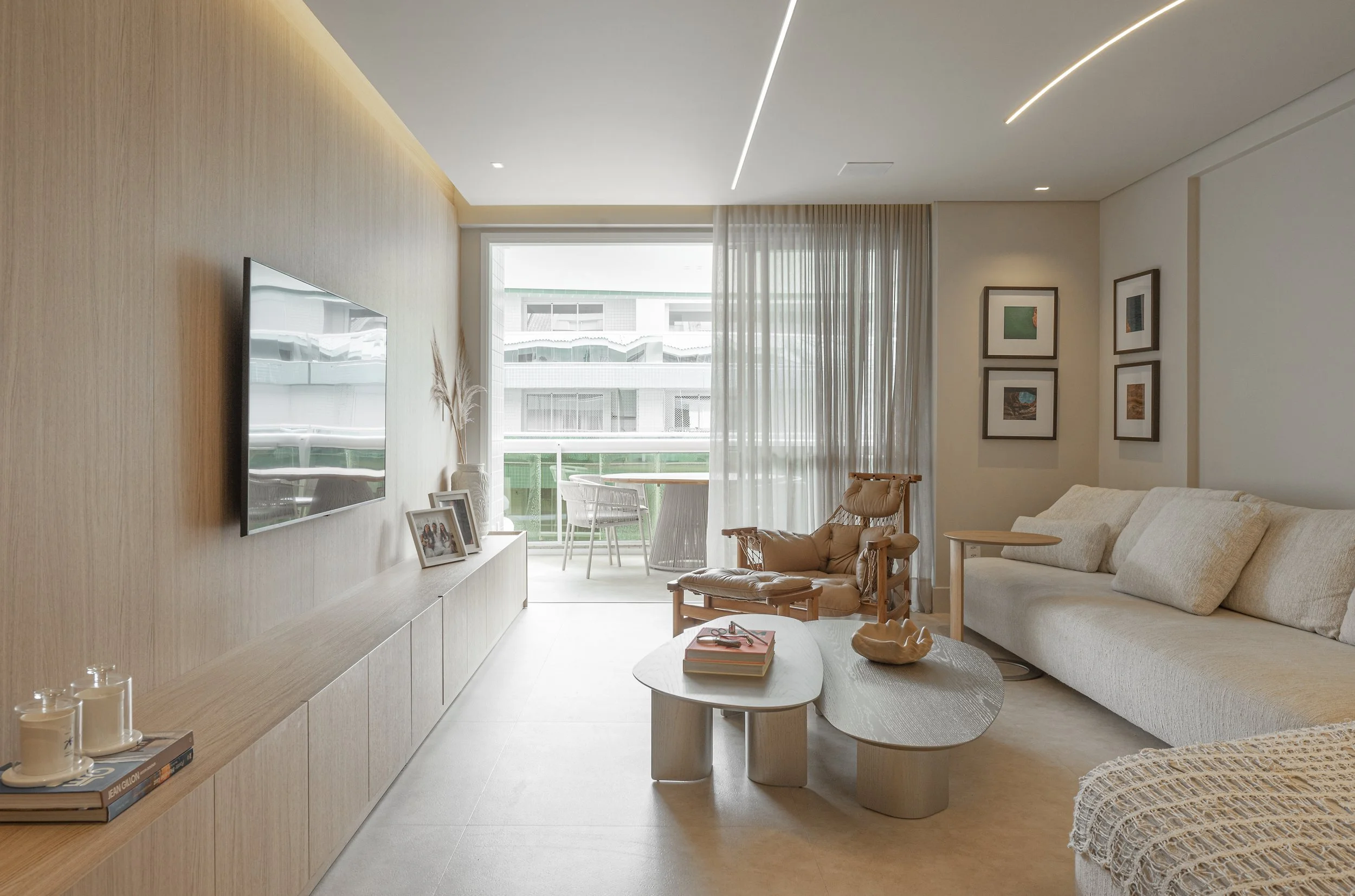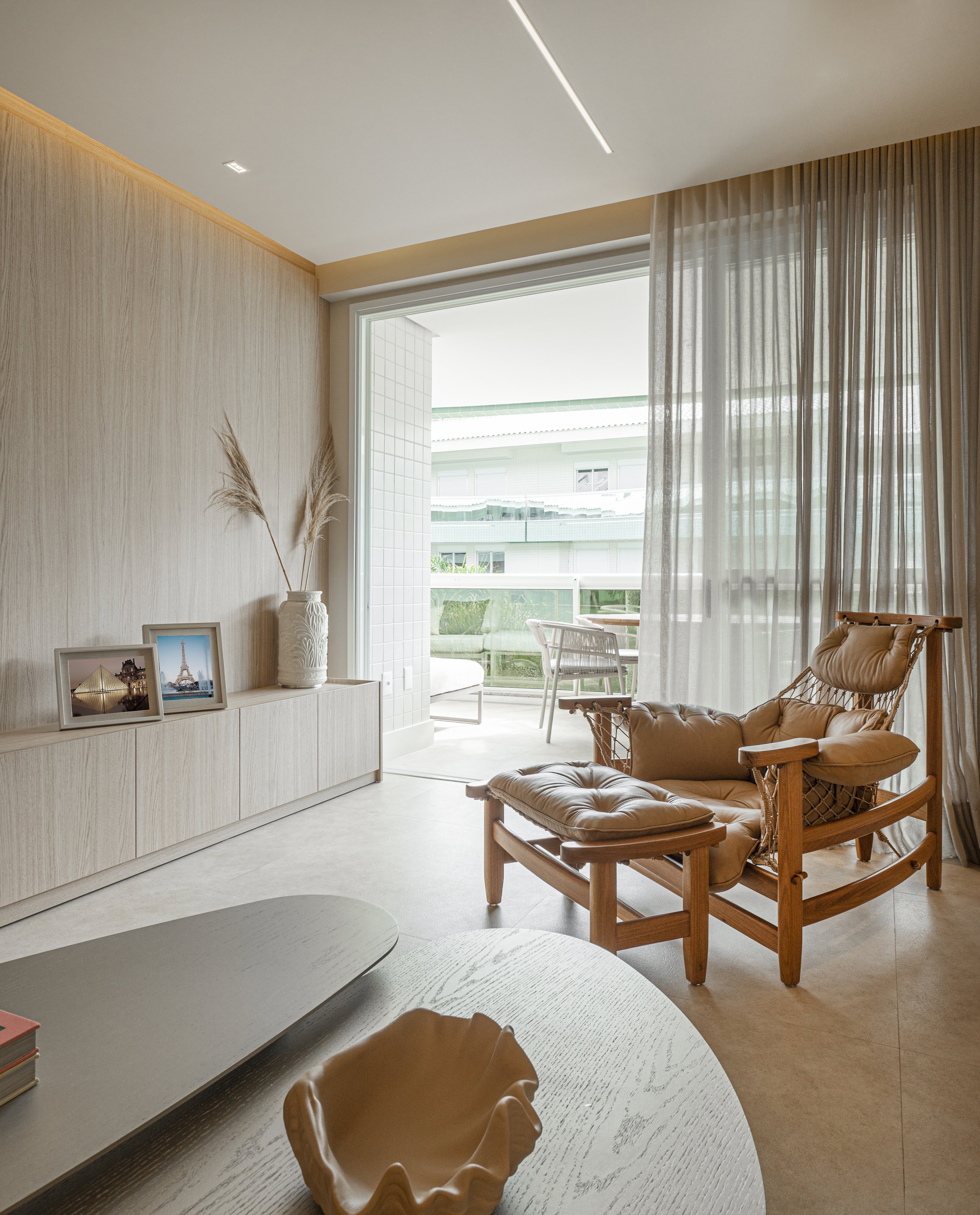 Desta vez, desenvolvemos o apartamento de praia com uma proposta que une a elegância sutil do minimalismo com a serenidade e funcionalidade do japandi, criando um ambiente leve, acolhedor e sofisticado, perfeito para momentos de descanso e convivência à beira-mar, valorizando materiais naturais e acabamento de alta qualidade.
